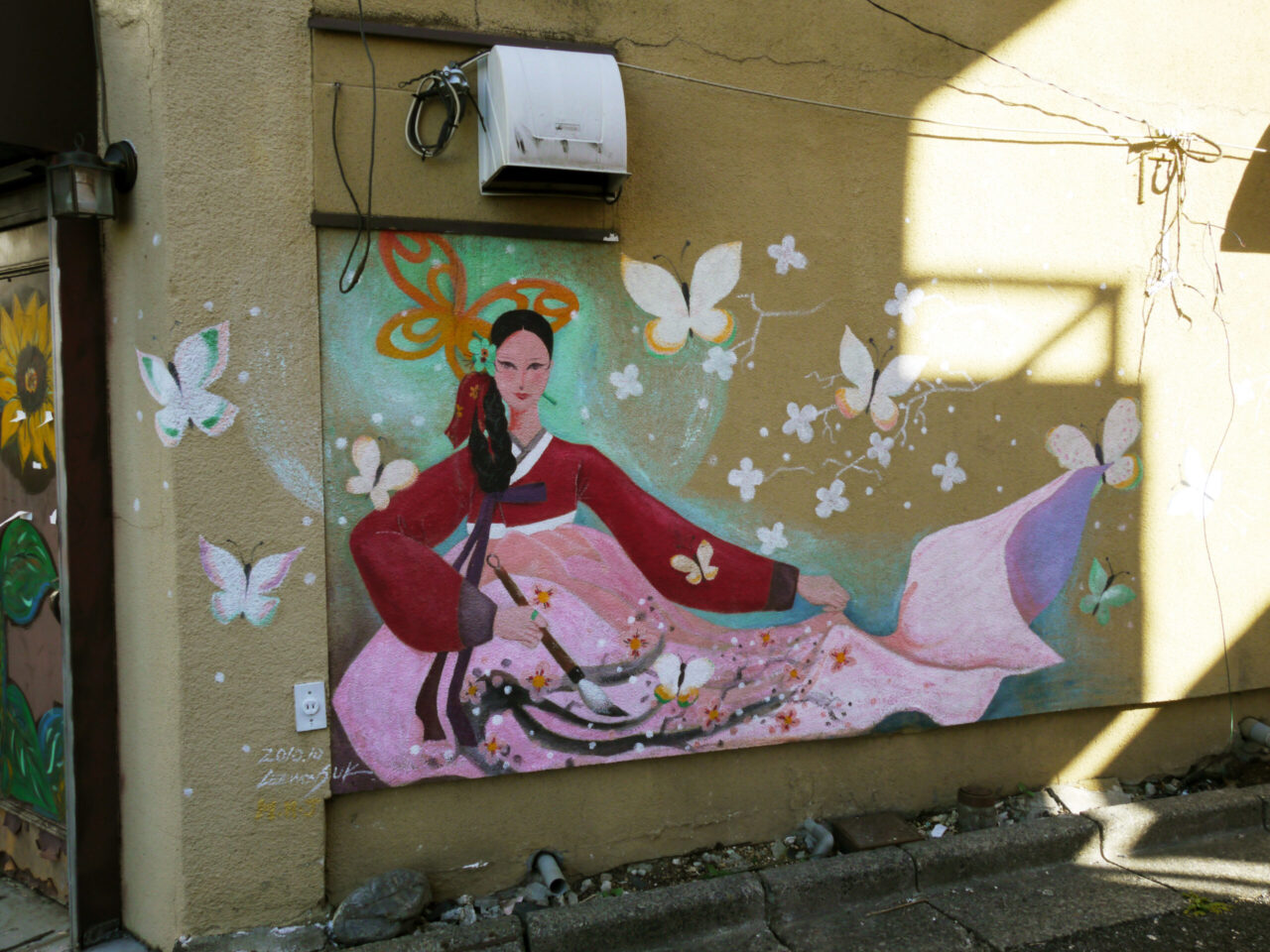 リリー・フランキーが描いた壁画、エディーズのヒップホップアート、スナックの壁に描かれたチマチョゴリの少女など、ストリートアートが楽しめる。