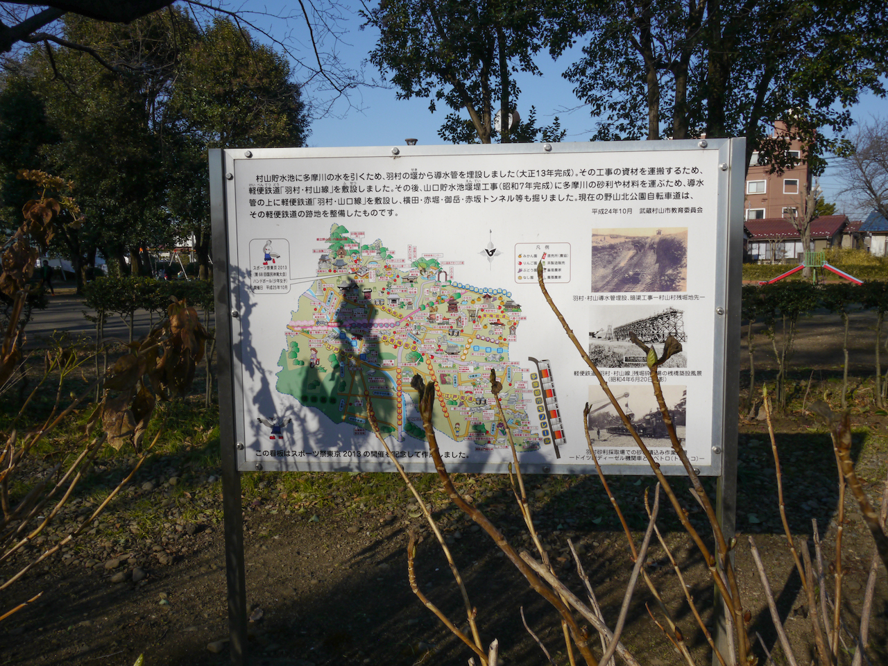 『羽村・山口軽便鉄道』は、羽村取水堰から、多摩湖と狭山湖をつなぐ廃線だ。遺構らしきものは狭山丘陵の山道にわずかに残るのみだが、武蔵村山市内の一直線の道筋にも、当時の面影をうかがうことができる。