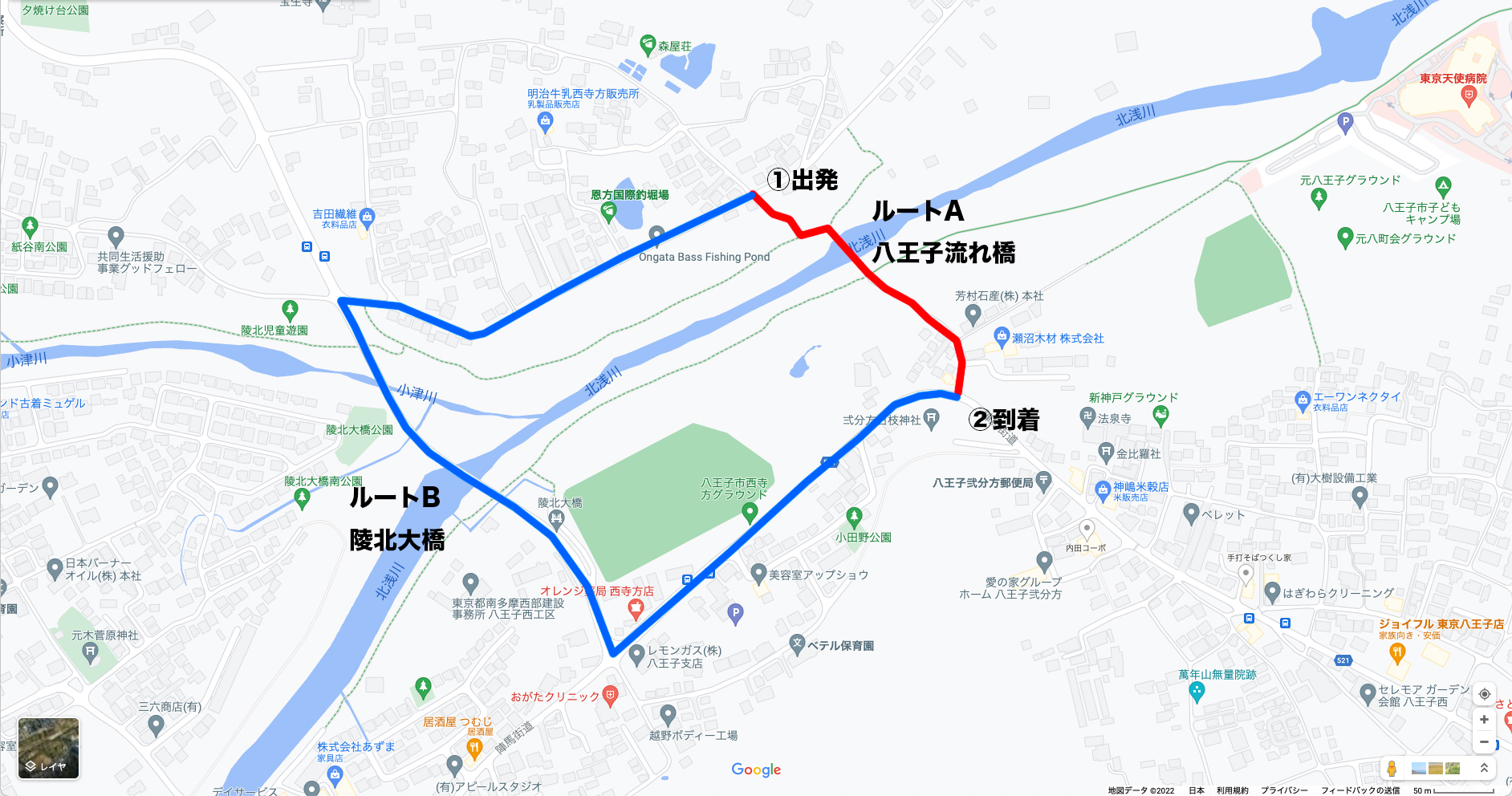 例えば、イラストのルートA(赤線)なら、西寺方町から大楽寺町の陣馬街道に出るのに4〜5分(約250m)。しかしルートB(青線)で、西の陵北大橋を渡ると、15分以上かかる(約1100m)。通勤通学で利用する住民にしてみれば、この差はめちゃくちゃデカい。