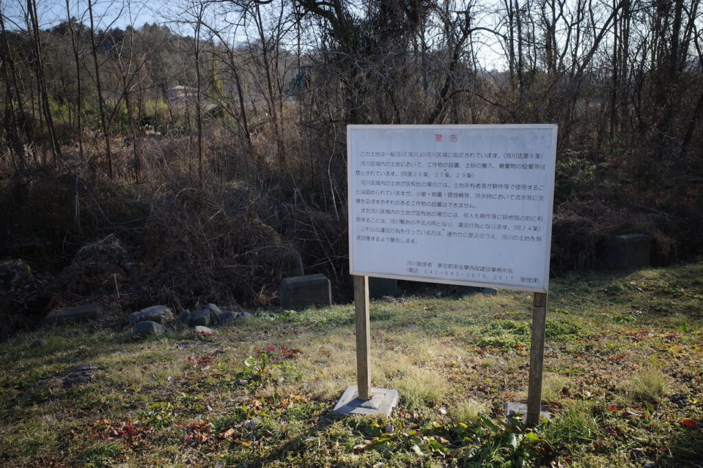 当初は「河川敷に畑を作るのはすべて違法なんじゃないの?」と思っていたのだが、これは全くの誤解だった。東京都建設局が立てた看板に詳しい説明があり、都市計画法や河川法によって、小屋などの工作物は設置できないものの、耕作(畑)等で利用するのは全く問題ないらしい(もちろん河川区域内の民有地に限る)。