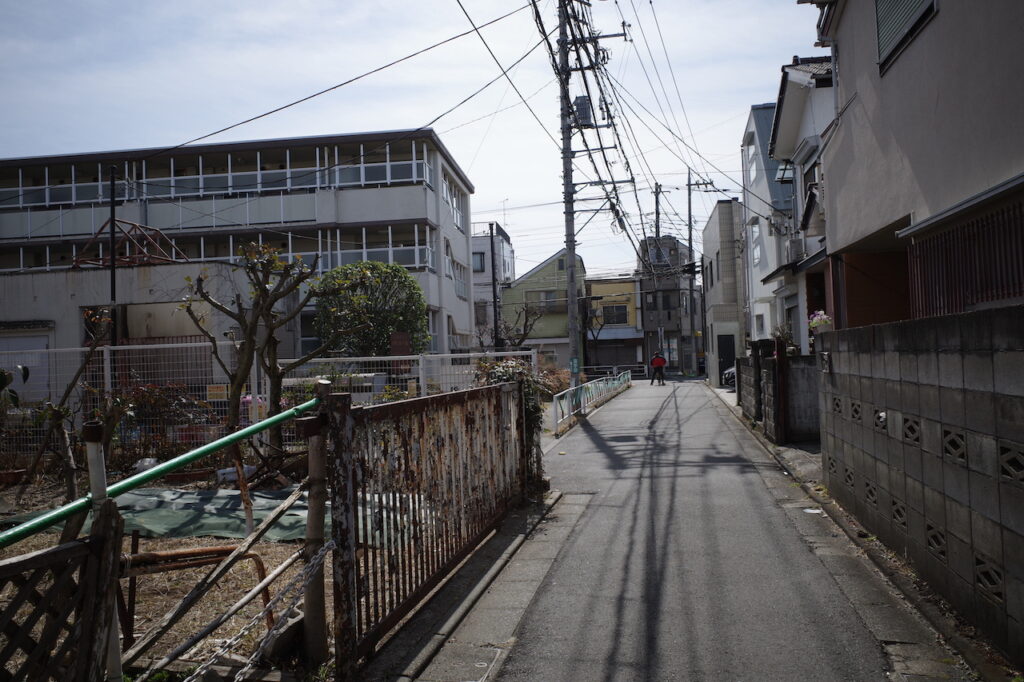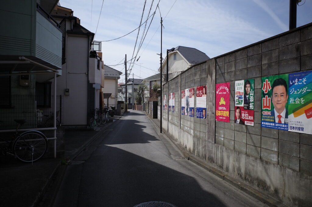 国分寺街道の脇にある路地。共産党、公明党のポスターを眺めながらずんずん進むと、偽装白バイが停まっていた空き地に出る。