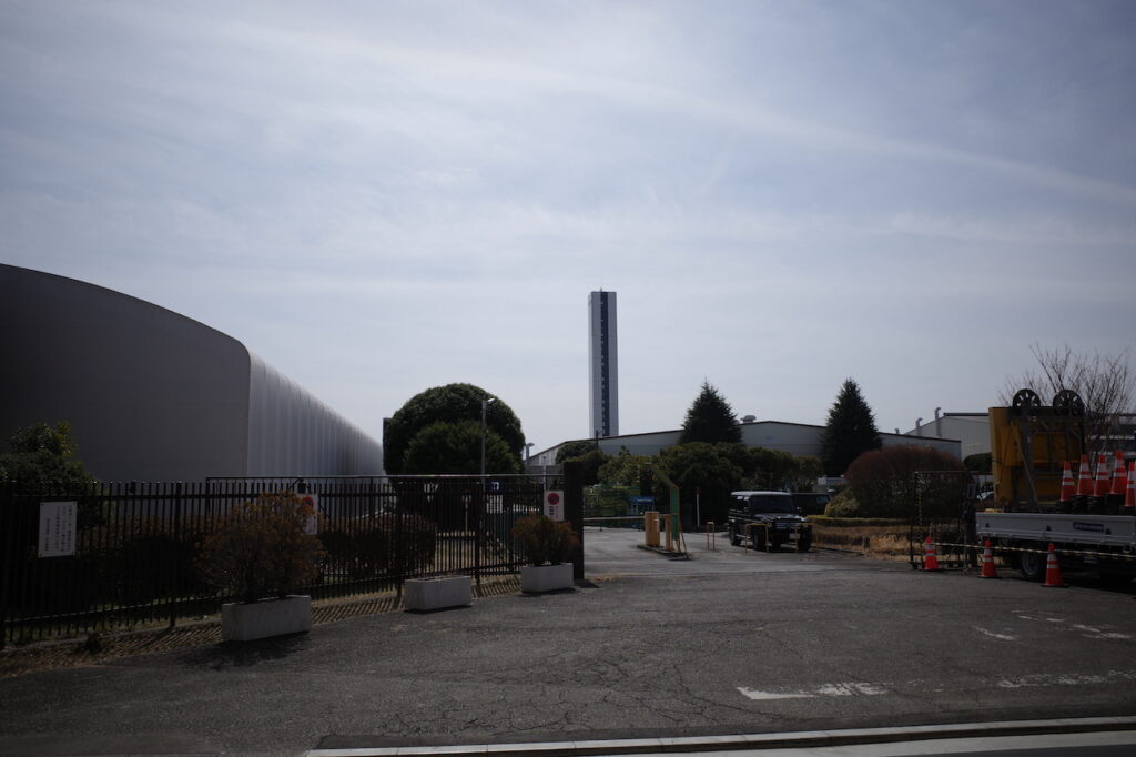 JR武蔵野線のアンダーパスをくぐると、東芝府中工場の工場群が見える。かなたにそびえるのは、高さ135.65mのエレベーター試験塔だ。現金輸送車が運んでいた3億円は、この東芝府中工場の従業員のボーナスだった。ちなみに、リーチ・マイケル主将率いる東芝ラグビー部の練習場は、この向こう側にある。