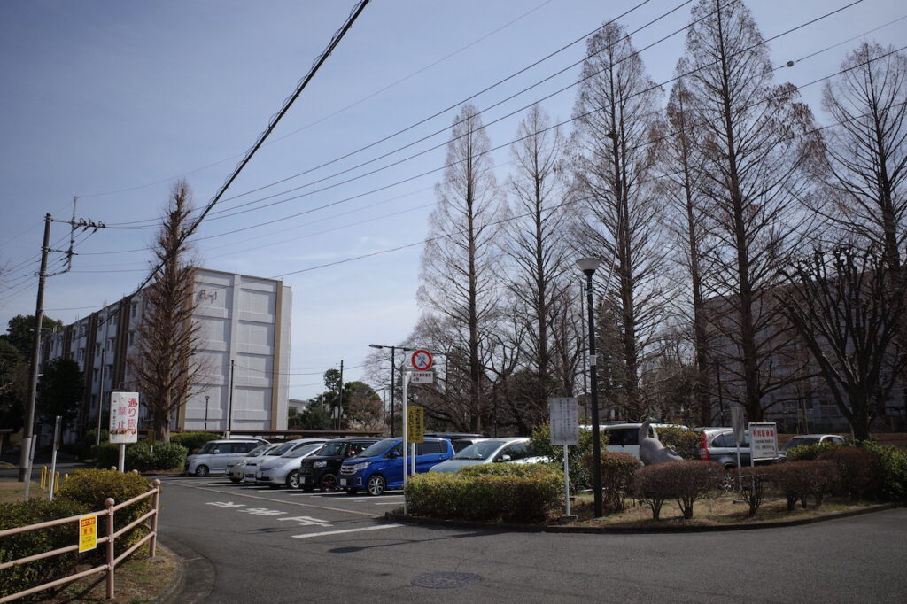 この駐車場の奥に、カバーをかけられた逃走車両が放置されていた。読売新聞オンライン『深読みチャンネル』に当時の写真が掲載されているが、それを見るとこの辺りの風景は当時と変わらない。奥に見える背の高い木も同じ。事件から50年以上経った今、同じ場所を歩いていると何か不思議な感じがする。