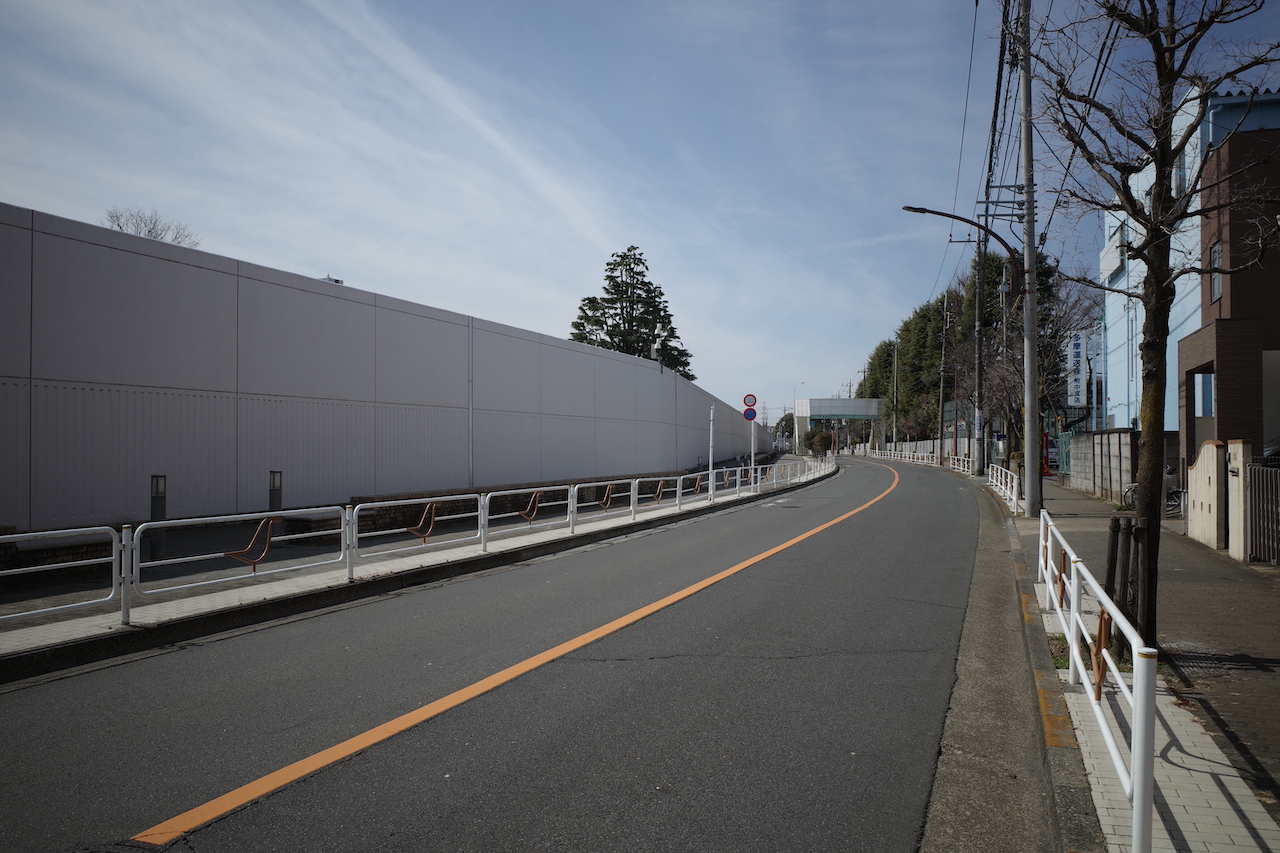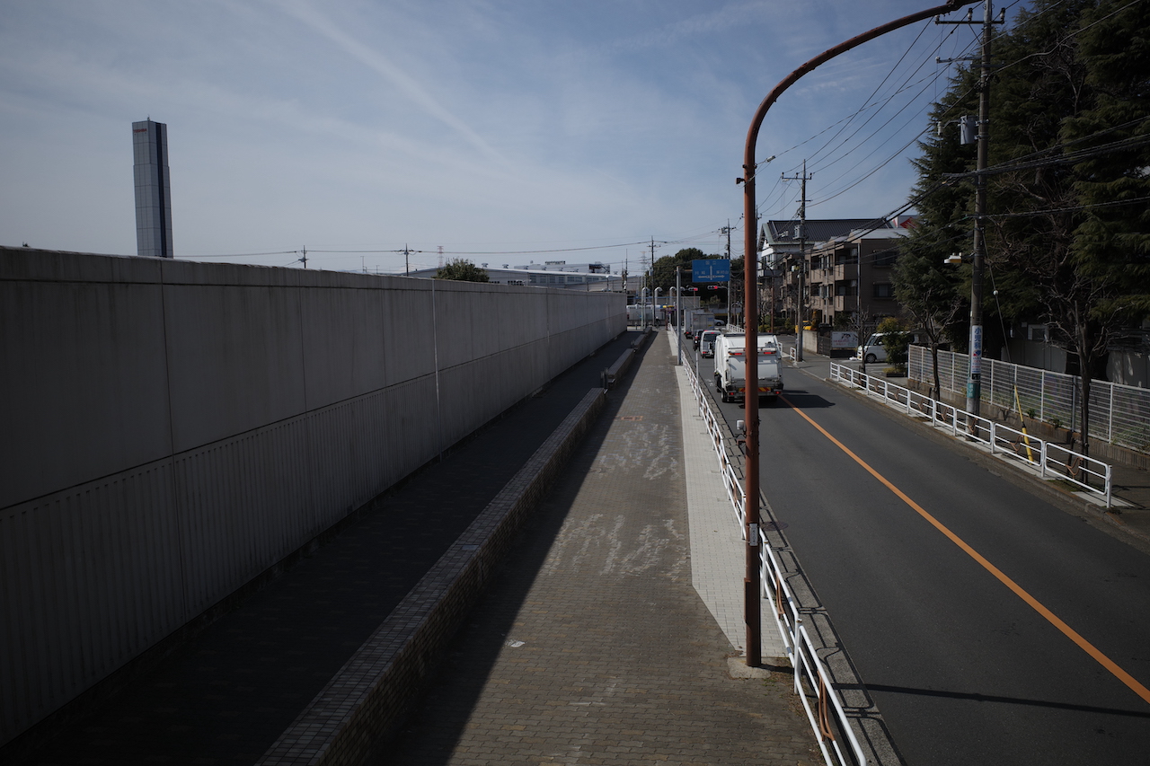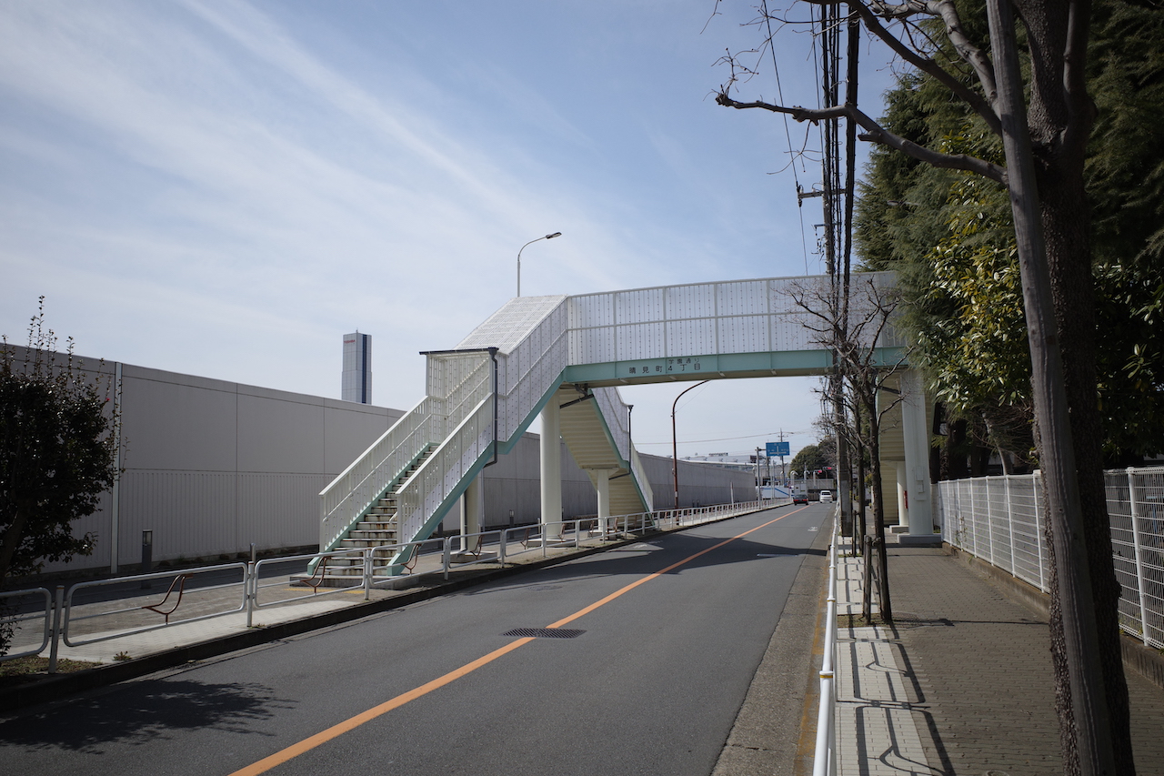 歩道橋から東芝府中工場方面を眺める。左手に見える塔は東芝の試験施設(監視塔ではない)。