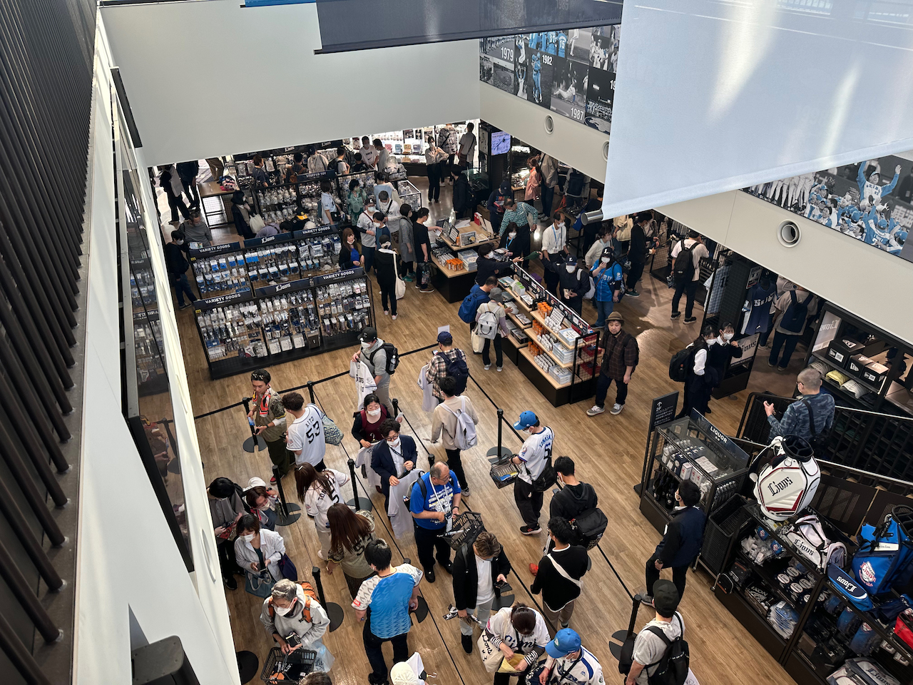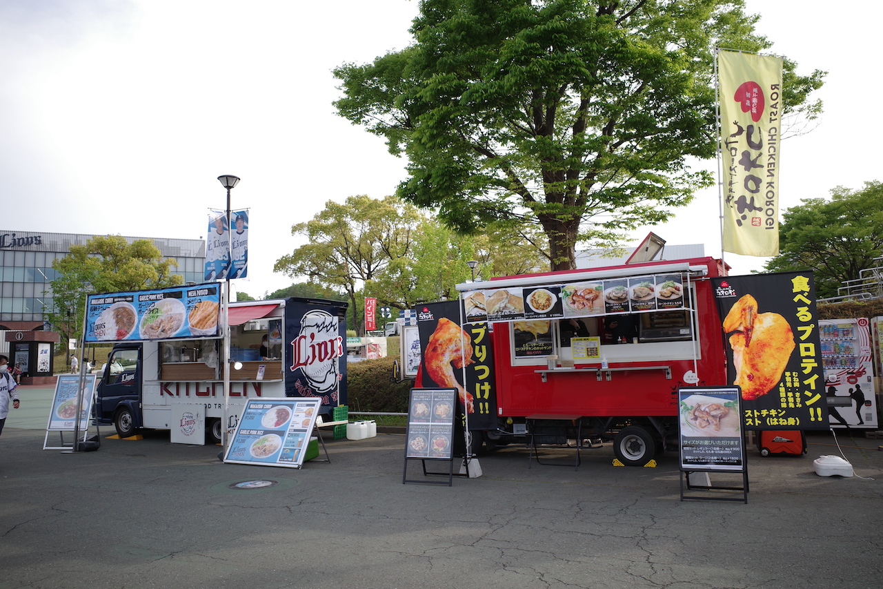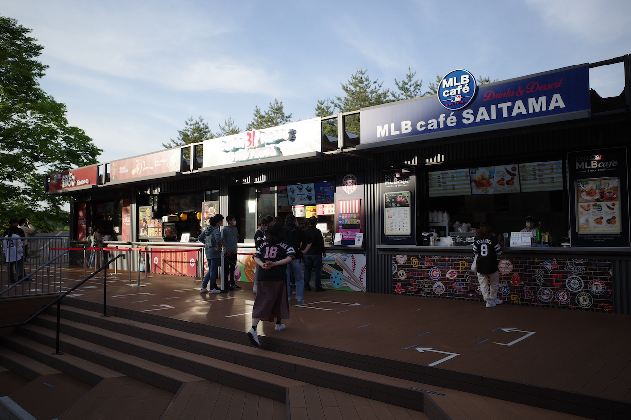 スタンドの外周には、英国風パブ、ハンバーガー屋、パフェ屋、エスニック料理屋、唐揚げ屋、肉丼屋、餃子屋、アイスクリーム屋、とんかつ屋、たこ焼き屋、油そば屋などが並ぶ。選手がプロデュースしたオリジナル弁当なんかも売っていて、それらを見ながら歩くだけで楽しい。