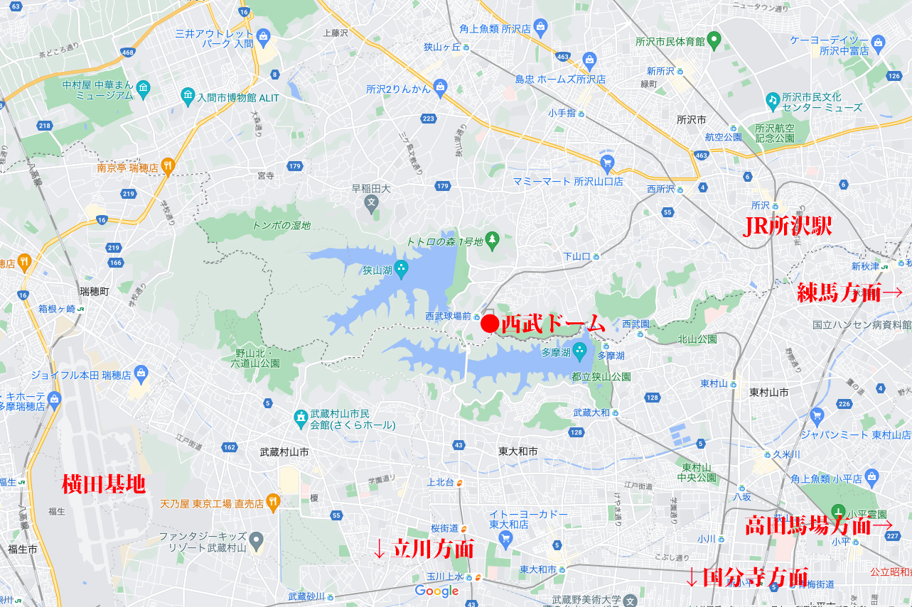 1951年、西武グループが戦争によって休止していた西武狭山線(西所沢駅〜西武球場前駅)を再開、行楽地として大規模な開発をはじめた。いまでは西武ドームを筆頭に、ゴルフ場、競輪場、巨大プール、遊園地、屋内スキー場などを擁する人気スポットになっているわけですが……地図を見ればわかるとおり、球場がいまも狭山丘陵の奥の奥にあることに変わりはない。